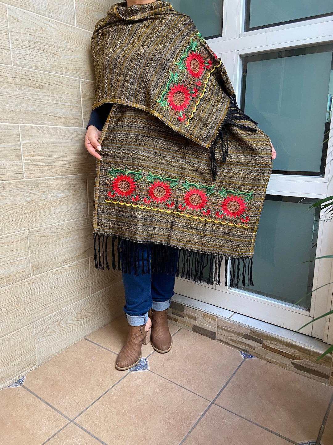 Material: Poliéster. Descripción. Chal Bordado En La Forma Del Pico. Ancho: 200 Cm. Altura: 130 Cm. Flecos: 25 Cm. Material