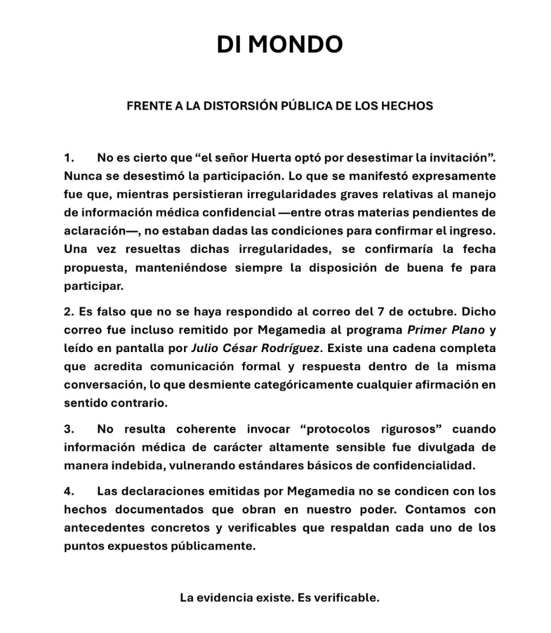 Otro punto de alta tensión fue la respuesta a un correo electrónico del 7 de octubre, que Mega acusó que el socialité no contestó. Di Mondo tildó esto de “falso”, recordando que dicha cadena de mensajes fue incluso leída en pantalla por Julio César Rodríguez durante su entrevista en Primer Plano.