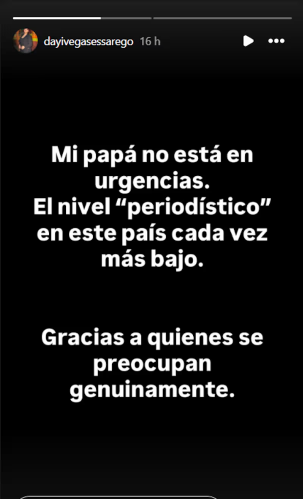 La joven no tuvo piedad con los profesionales de la comunicación y disparó sin anestesia contra el tratamiento que se le está dando a la noticia: “Mi papá no está en urgencias. el nivel ‘periodístico’ en este país cada vez más bajo”, sentenció con evidente molestia. Dayane fue enfática en pedir que no se inventen situaciones críticas de salud, especialmente en un momento donde el “rey de la cumbia” se encuentra bajo el escrutinio público por sus problemas sentimentales y judiciales tras el polémico quiebre con la argentina.