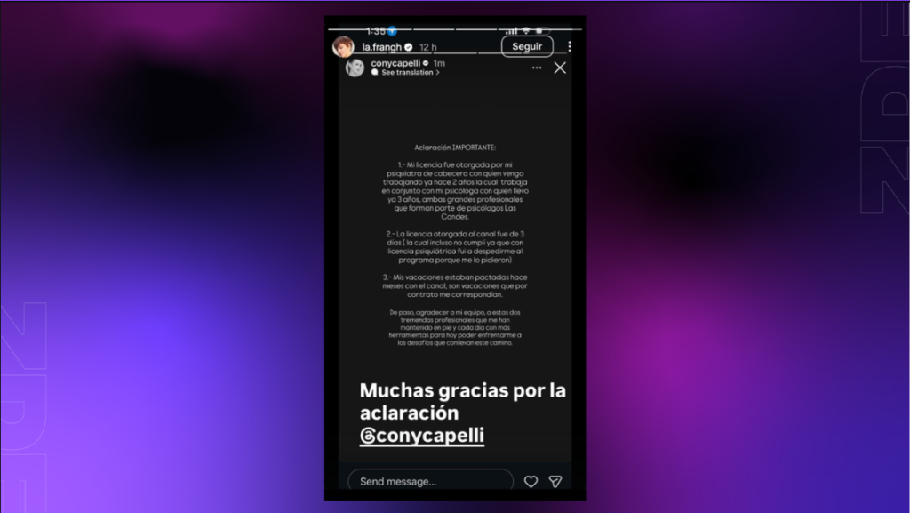 “Después del escándalo de este país con licencias fraudulentas, a una persona con licencia psiquiátrica se le permite descansar en el territorio nacional… Cancún no está incluido”, lanzó la conductora con su característico tono irónico. sin embargo, la respuesta de la Capelli fue inmediata y contundente. A través de sus plataformas digitales, la bailarina aclaró que su tratamiento es de larga data con profesionales de Psicólogos Las Condes y reveló que su licencia fue de apenas tres días, la cual incluso interrumpió para ir a despedirse del programa por petición del canal.