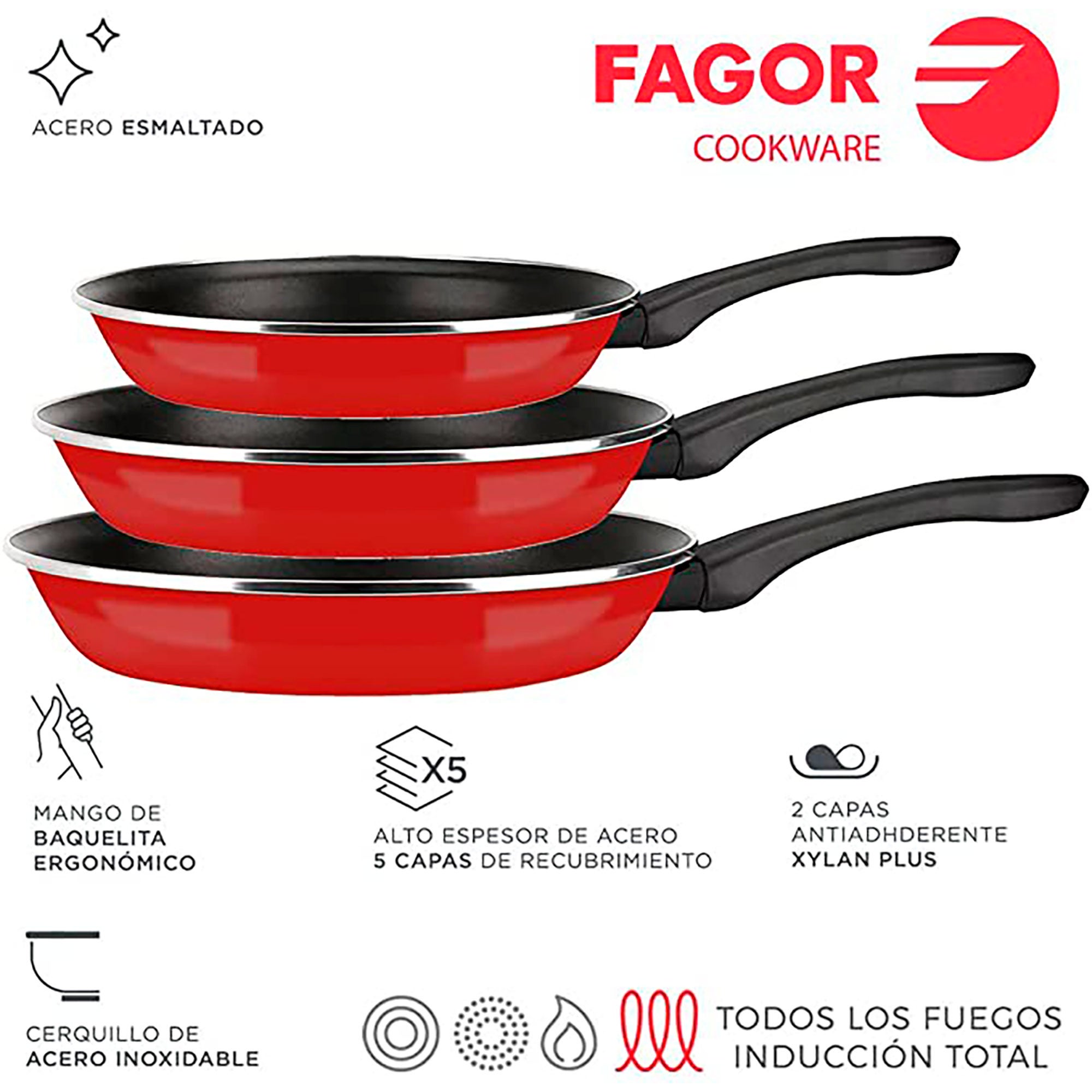 Acero Esmaltado de 1,5mm. · Alto espesor de acero con 4 capas de recubrimiento. · Antiadherente de doble capa Xylan Plus. · Aptas para todo tipo de cocinas... Set Juego Sartenes 20-24 Cm Inducción Aluminio Extra Grueso Antiadherente Ecologico Sin Pfoa Fagor Negro Nela Marble 85347138 Sus mangos de baquelita son ergonómicos de tacto suave y frío por lo que ofrecen un agarre cómodo y mantienen tus manos a salvo de las quemaduras. Fondo de inducción total. Alto espesor de acero con 4 capas de recubrimiento. Cerquillo de acero inoxidable. ESPECIFICACIONES: Acero Esmaltado de 1,5mm. Antiadherente Xylan Sin Pfoa Fagor SARTEN OPTIMAX Antiadherente Doble Capa, Acero Esmaltado De 1,5mm De Espesor, Compatible Con Toda Clase Cocina, Inducción, Cerquillo De Acero. Apta Lavavajillas (20 24 28 Set Sartenes Fagor Optimax Acero Esmaltado Xylan Sin PFOA Mango ergonómico de baquelita termoaislante. ANTIADHERENTE DOBLE CAPA: El antiadherente XYLAN PLUS de doble capa libre de PFOA, plomo y cadmio impide que los alimentos se peguen a la pieza y facilita la limpieza. Incorpora cerquillo de acero inoxidable para mayor durabilidad y seguridad durante el uso. Incluye 2 Sartenes: El set contiene una sartén de 20 cm y otra de 24 cm, ideales para el día a día en cualquier cocina APTA TODO TIPO DE COCINAS: Permite cocinar con muy poca cantidad de aceite y son aptas para todo tipo de cocinas: Vitrocerámica, Gas, Eléctrica, Inducción. 3 PIEZAS: El lote incluye 3 sartenes: Ø 20 cm / Ø 24 / Ø 28 cm. ACERO ESMALTADO: Sartenes de alta calidad fabricadas en acero esmaltado de 1,5mm de espesor con un recubrimiento esmaltado exterior. INDUCCIÓN: El fondo difusor de inducción total FULL INDUCTION proporciona una distribución del calor rápida y homogénea, lo que implica un menor gasto de energía para cocinar los alimentos.