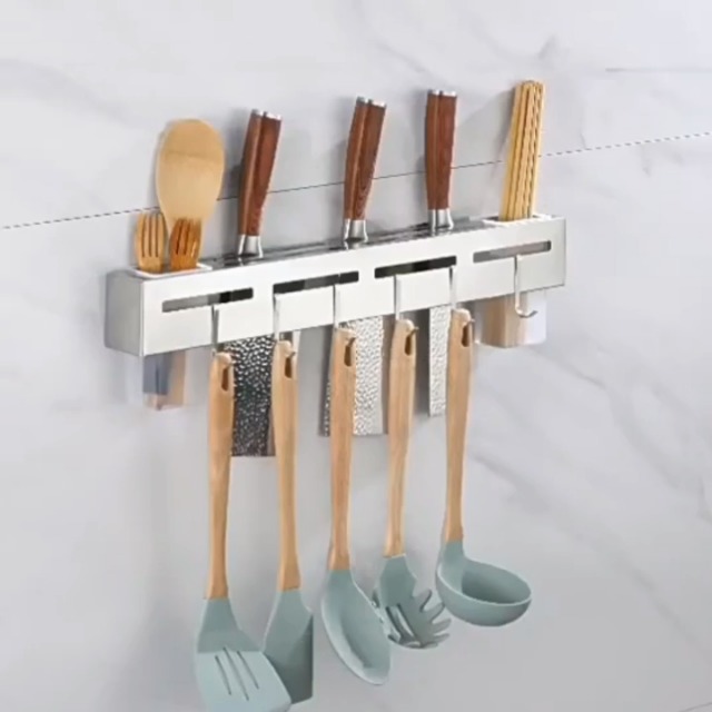 Taladrado: Utilice los tornillos incluidos en el paquete para instalarlo (se necesita una broca de 6 mm para taladrar) Estante de Pared Multifuncional: el estante de utensilios de cocina multifuncional montado en la pared viene con 6 ganchos extraíbles y mide aproximadamente 40 cm de longitud y puede contener de 4 a 7 cuchillos con soportes para palillos y cucharas en cada extremo. Si desea que tenga una mayor capacidad de carga, puede elegir el método perforado (la capacidad de carga de la instalación sin perforación es de unos 30KG). Nota: No apto para paredes desconchadas/papel pintado/paredes pintadas, etc Ámbito de Uso: Los estantes de pared para cocina se suelen utilizar en superficies lisas y resbaladizas, como superficies de baldosas lisas, superficies de mármol, superficies de vidrio templado, paredes de madera dura. ¿Se siente frustrado porque sus cuchillos están desordenados y no tiene dónde guardarlos? No se preocupe, nuestro organizador de cuchillos le ayudará a organizar su cocina y decir adiós a su cocina desordenada. Instalación sin perforación: 1., Marque la posición de instalación en ambos lados del producto; 2., Aplique adhesivo sin clavos en el respaldo; 3., Instale en la pared y presione durante 2-3 minutos; 4., Coloque el adhesivo auxiliar para ayudar a fijarlo; 5., Instale el tema del portacuchillas en el respaldo; 6., Deje transcurrir 72 horas para su uso., Taladrar e instalar: 1., Marcar la posición de instalación en ambos lados del producto; 2., Taladrar agujeros con un taladro eléctrico de 6mmd; 3., Introducir los tornillos de expansión; 4., Fijar la placa trasera con tornillos y atornillarla; 5., Colocar el soporte para cuchillos en la pared; 6., La instalación está completa y lista para su uso. Lista de embalaje: 1* organizador portacuchillos Accesorios de montaje perforado Accesorios de montaje sin perforación Cuchillero Acero Inoxidable Soporte Para Utensilios De Cocina De Acero Inoxidable, Organizador Soporte Cuchillos Ganchos Extraíbles Sobresaliente Capacidad de Carga:El estante colgante para almacenamiento de cuchillos tiene una carga máxima de 20KG usando el método de montaje autoadhesivo y 30KG usando el método de montaje taladrado Atributos: Material: acero al carbono engrosado Color: negro Proceso de fabricación: lacado al horno Método de instalación: instalación sin perforación / instalación con perforación Tamaño: 40*5*5,5 ¡Nota: Datos medidos a mano, el tamaño del producto puede tener errores, por favor prevalecer en especie! Las mejores ofertas en Los titulares de Cuchillo de cina de acero inoxidable | eBay Se puede instalar de dos formas, sin perforar o perforado. Alta calidad: nuestro soporte para utensilios de cocina está fabricado en acero inoxidable de alta calidad, pintado con spray, antioxidante y tratado con... El cuchillero, toallero y especiero de pared todo en uno para la cocina ha demostrado ser un accesorio realmente conveniente en mi espacio culinario. La combinación de estas funciones es genial para maximizar el espacio en mi cocina, manteniendo mis cuchillos a mano, mis toallas limpias y mis especias organizadas También viene con 6 ganchos extraíbles para colgar tablas de cortar, sartenes, espátulas, etc.