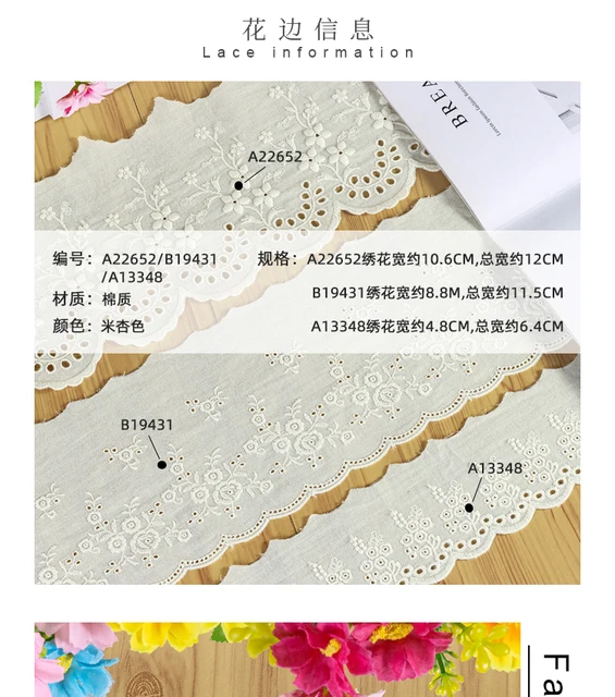 Es fácil de usar y se puede cortar según tus necesidades. Adorno de encaje de poliéster, blanco, negro, rosa y azul, tela de encaje bordado Floral, cinta para recortar vtido, suministros para disfrac, manualidad DIY - AliExprs Información del producto: Nombre del producto: Cenefa decorativa bordada de encaje de algodón utilizada para coser ropa de falda y accesorios decorativos de bricolaje Material: algodón. Es fácil de usar y se puede cortar según tus necesidades. Esta cenefa de encaje de algodón bordado de estilo vintage mide 11 cm de ancho y cada rollo mide aproximadamente 3 yardas de largo, lo suficientemente largo para satisfacer tus diferentes necesidades Tejido de algodón de alta calidad, resistente al desgaste y elástico. Material Bricolaje Bodas Decoración 5 Yardas 8 Cm De Cinta De Encaje De Algodón Vintage Bordado Encaje Encaje Tela De Material Decoración Encaje Azul Marino Esta cenefa de encaje de algodón bordado de estilo vintage mide 11 cm de ancho y cada rollo mide aproximadamente 3 yardas de largo, lo suficientemente largo... La cenefa de encaje está disponible en 10 colores vibrantes populares: crema, blanco, beige, rosa, morado, verde, gris, burdeos, azul marino, negro. Gracias por tu comprensión., 3., Los tamaños de los productos individuales pueden variar ligeramente. Puedes dejar volar tu imaginación, fuerza y creatividad., !, ! Gracias por tu comprensión. Asegúrate de que no te importa antes de comprar. Exquisitas cintas decorativas para decoración de fiestas, estampado floral, fabricación de adornos para el cabello, manteles de encaje, decoración de ropa vintage, proyectos de costura y manualidades, lencería, muñecas, cortinas, faldas, textiles para el hogar, bolsos, etc.