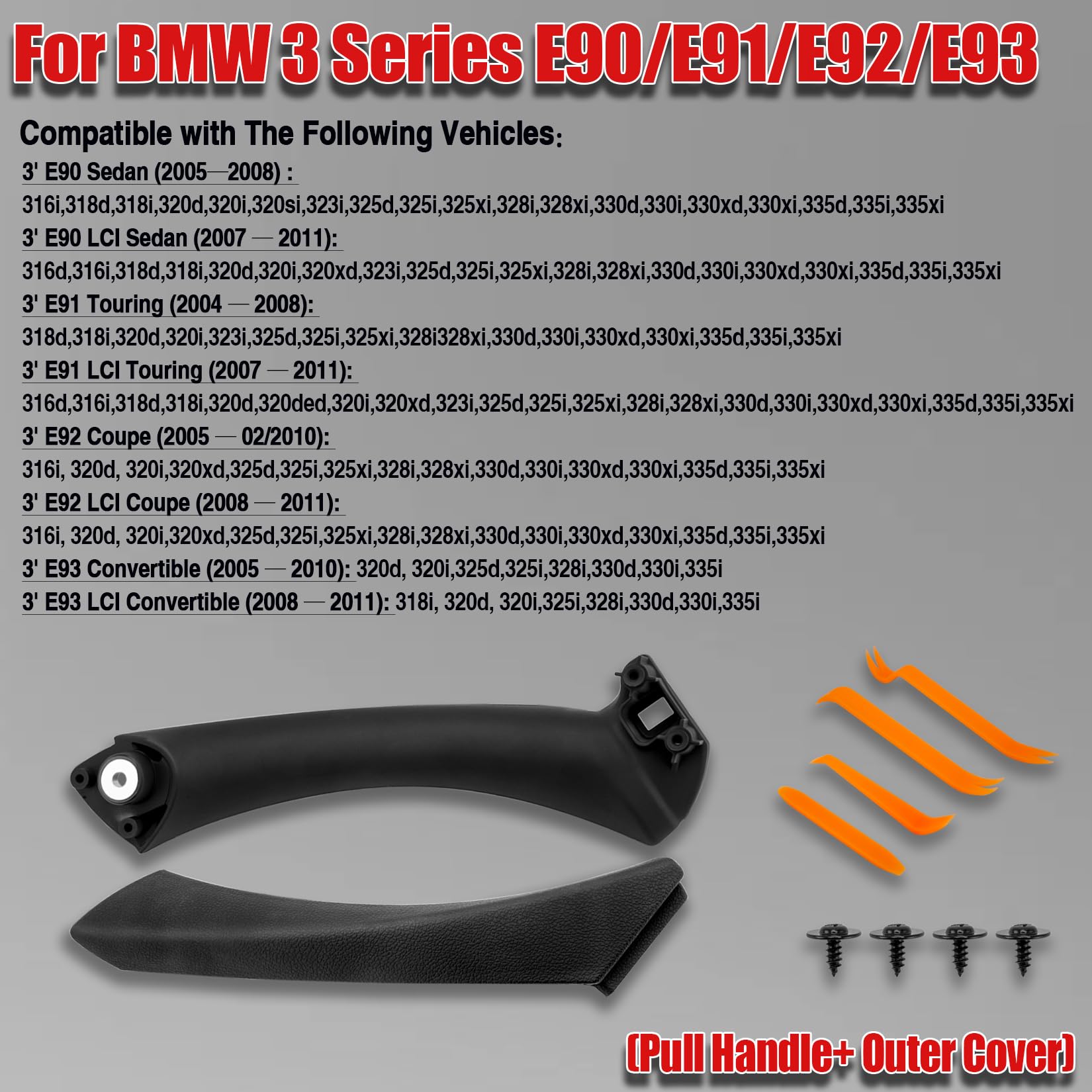 【Sensación y Aspecto Cómodos】: evita el molesto desgaste que se produce a medida que el reposabrazos envejece y da como resultado un agarre pegajoso que podría manchar la ropa. Extremadamente duradero, ligero, portátil, fácil de limpiar, más suave y sólido. Excelente reemplazo Manija Interior Del Panel De Puerta Izquierda Y Derecha... Compatible con BMW Serie 3 E91 Touring (2004–2008): 318d, 318i, 320i, 323i, 325d, 325xi, 328i328xi, 330d, 330i, 330xi, 335d, 335i. Además, esta manija de puerta conserva el color original de su automóvil, es resistente a manchas y rayones. Compatible con BMW Serie 3 E91 LCI Touring (2007-2011): 316d, 316i, 318d, 318i, 320d, 320ded, 320i, 320xd, 323i, 325d, 325i, 325xi, 328i, 328xi, 330d, 330i, 33., 0xd, 330xi, 335d, 335i, 335xi En comparación con el mango original, está fabricado con un material más rígido y no con goma, que puede dañarse. La manija interior original de la puerta está hecha de goma, que se desgasta y se oxida al cabo de unos años. Compatible con BMW Serie 3 E90 Sedan (2005-2008): 316i, 318d, 318i, 320d, 320i, 320si, 323i, 325d, 325i, 325xi, 328i, 328xi, 330d, 330i, 330xd, 330xi, 335d, 335i, 335xi y las hojas se alejan sin esfuerzo. Juego de tirador de puerta Interior LHD RHD, Beige, negro y gris Sobre este artículo Ajuste: 6 cubiertas de manija de puerta compatibles con BMW Serie 3 E90 4 puertas Sedan /E91 5 puertas Touring /E92 Coupe/E93 Convertible. Nuestra cubierta interior para manija de puerta está meticulosamente diseñada para adaptarse perfectamente a las especificaciones originales de fábrica, garantizando un ajuste perfecto. Diseño a presión Compatible con BMW Serie 3 E93 Convertible (2005-2010): 320d, 320i, 325d, 325i, 328i, 330d, 330i, 335i E92 Coupé (2005-2010), E92 LCI Coupé (2008-2011), E93 Convertible (2005-2010) y E93 LCI Convertible (2008-2011). Al elegir esta cubierta para tirador de puerta serie 3 e93 actualizada, ¡ya no tendrá que preocuparse por reemplazar la placa de la manija en el futuro! El paquete incluye: 2 PCS manija de puerta interior izquierda BMW Serie 3 E90/E91/E92/E93 Nuestro mango interior mejorado es menos propenso a romperse y más duradero. Conformación 1:1 Nuestros manija puerta interior bmw están impresos 1:1 según los datos originales del vehículo. Bmw E92 Altsbaos 6 PCS Compatible Con Tirador Puerta Bmw Serie 3 E90/E91 Tirador De Puertas Bmw Compatible con BMW Serie 3 E93 LCI Convertible (2008-2011): 318i, 320d, 320i, 325i, 328i, 330d, 330i, 335i. Esto proporciona una experiencia de uso más cómoda. 【Modelo de Coche Compatible】: esta manija compatible con manija de puerta interior BMW Serie 3 E90 Sedan (2005-2008), E90 LCI Sedan (2007-2011), E91 Touring (2004-2008), E91 LCI Touring (2007-2011). Nuestra manija de puerta e91 fue modelada a escala 1:1 según los datos originales del automóvil, realizada en una sola pieza, con líneas suaves y transiciones redondeadas naturales. Compatible con BMW Serie 3 E92 LCI Coupé (2008–2011): 316i, 320i, 320xd, 325d, 325i, 325xi, 328i, 328xi, 330d, 330xD, 330xi, 335d, 335i, 335xi. Sin embargo, nuestra manija de puerta actualizada se puede reparar cuando se desgasta: simplemente reemplace la pieza de la manija sin tener que reemplazar todo el panel de la puerta, brindando una experiencia completamente nueva. Una simple pasada con un paño es suficiente para eliminar la suciedad. Materiales de alta calidad: Nuestras maneta puerta e91 están hechas de material ABS+PC y TPU resistente a los arañazos. A altas temperaturas puede incluso derretirse y convertirse en un elemento decrépito y ya no funcional.