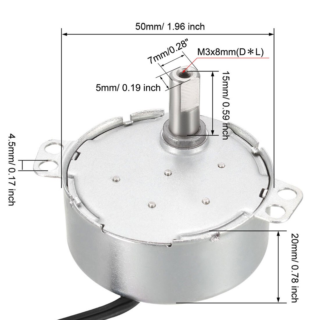 Uso generalizado Se utiliza principalmente para la máquina encoladora, monitor, cortina eléctrica, luces de escenario, movimiento eléctrico publicitario, aparatos eléctricos e instrumentos de ciencia y educación. Tamaño: el motor de sincronización de la plataforma giratoria tiene 1., 96 pulgadas / 50 mm de diámetro, 0,78 pulgadas / 20 min de altura; El cable azul es 0,08 pulgadas / 2 mm de diámetro, 16,14 pulgadas / 410 mm de longitud. Se utiliza principalmente para encolar máquinas, calentadores, monitores, cortinas eléctricas, luces de escenario, movimiento eléctrico publicitario, aparatos eléctricos, instrumentos científicos y educativos Motor Sincrónico Ac 5-6rpm 50-60hz Ccw/cw 4w | Meses sin interés Versatilidad de voltaje:Compatible con 208-230/240 V, el motor... Aplicaciones: los motores síncronos son buena herramienta para el proyecto hecho a mano, bricolaje; Adecuado para el aparato electrodoméstico, máquina del calentador, ventilador eléctrico, el árbol de Navidad, aire acondicionado, masajeadores, visualizador dinámico, artes y artesanías de iluminación, máquina de palomitas de maíz, etc. Motor Lento Alta Par Metal Motor Modelo Guía 4w Motor Sincrónico 24V 4W 5- 6RPM - Para Manualidades, Modelos, Proyectos Motor Baja Velocidad Motor Para Proyectos DIY Modelo Parámetros detallados: la potencia es de 4 vatios; La frecuencia es de 50-60 Hz; Manera de trabajar es C / ; rango de voltaje de CA es de 220-240 V; Velocidad de rotación es 5-6 R por minuto. Opiniones de clientes Sourcing Map Sincrónico Sincronizar Motor AC 24V 4W 5-6RPM/MIN 50-60Hz Para Hecho Mano, Modelo O Guía Motor 4.2 /5 331 opinión Dar una opinión 16 avis pour la note d'une étoile 1 17 avis pour la note de 2 étoiles 2 33 avis pour la note de 3 étoiles 3 53 avis pour la note de 4 étoiles 4 212 avis pour la note de 5 étoiles 5 Ver todas las opiniones Especificación:Voltaje: AC 220-240VFrecuencia: 50-60HzVelocidad: 5-6RPM/MinColor: Tono PlataPotencia nominal: 4WForma de trabajo: CCW/CWEsfuerzo de torsión: 4kgf. Motor Para Maquetas Cortinas Eléctricas Motor Lento Alta Par Metal Bombilla Microondas Teka Sourcing Map Sincrónico Sincronizar Motor AC 24V 4W 5-6RPM/MIN 50-60Hz Para Hecho Mano, Modelo O Guía Motor Motor Toldo Electrico Exterior Motor 5-6 RPM Motor Pequeño Proyecto DIY