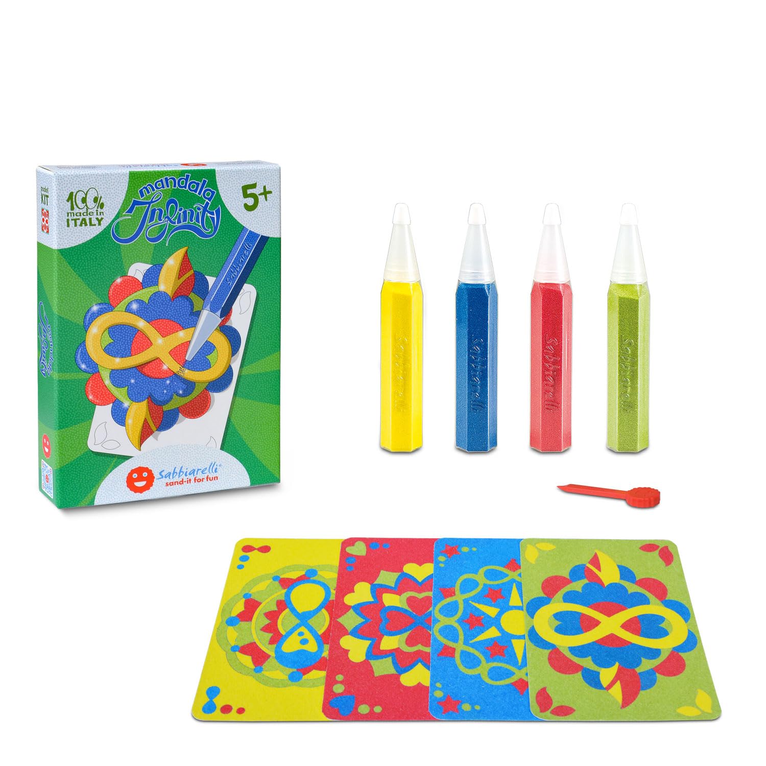 MANDALA INFINITY - Kit Créatif Avec 4 Feuilles Adhésives (15 X 10 Cm) Et 4 Stylos Sabbiarelli De Sable Coloré (bleu, Rouge, Jaune, Vert Clair), à Colorier Et à Transformer En Mandalas Scintillants